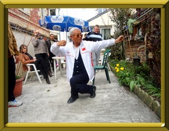 |  Maître Wang Wenyong dans ma cour démontrant une posture typique de Shuai Jiao de l'école Juin Baosheng le 8 avril 2012 |