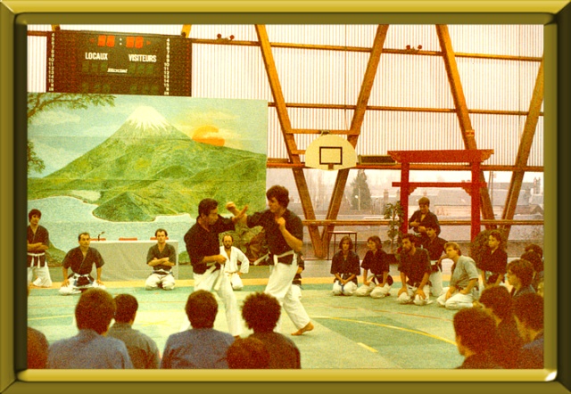 Karaté Jutsu-Karaté Contact-Yoseikan Budo-Yi Chuan-Taikiken-Shuai Jiao-Boxe Chinoise Sanda Sanshou-Qi Gong Maître Hiroo Mochizuki en 1984 bloquant un coup de poing circulaire sur Demerin David |  |