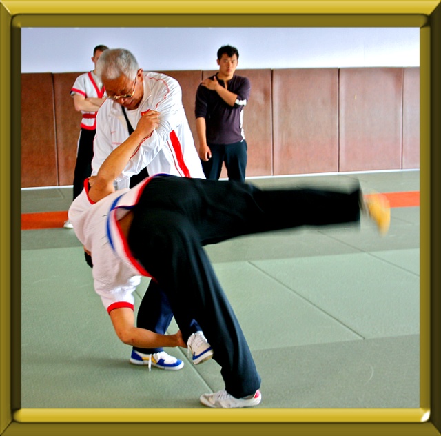 Karaté Jutsu-Karaté Contact-Yoseikan Budo-Yi Chuan-Taikiken-Shuai Jiao-Boxe Chinoise Sanda Sanshou-Qi Gong Maître Wang Wenyong âgé de 80 ans en stage en 2012 dans mon Club |  | Le Shuai Jiao Wushu Jin Baosheng « Lutte chinoise du grand maître Jin Baosheng», est une forme de lutte originale, issu du fameux camp d'entraînement « Shampuyin » où était formé les meilleurs lutteurs de l'empereur et de la Chine. La filiation du grand maître Wang Wenyong remonte à cette époque. La particularité de cette lutte est de s'être enrichi des autres wushu en intégrant des éléments de tai chi chuan, xing yi quan, bagua, shaolin. La lutte chinoise est un style incontournable, bien qu'elle ait suivit une évolution depuis 3000 ans. Il est difficile d'imaginer une compréhension des styles chinois sans un regard sur cette discipline. Le Maréchal Yue Fei encourageait ses soldats a pratiquer du xing yi et du shuai jiao. Preuve qu'à l'origine, il n'y avait pas de clivage entre les disciplines. Le shuai jiao est aussi à l'origine du wushu kung fu, sumo, du jiu jitsu, du judo, de l'aikido, du karaté et d'autres styles en Asie. Il est mis en avant la recherche d'efficacité des mouvements en couplant la souplesse du corps et l'énergie, ainsi que l'intention de l'esprit. C'est ainsi que le maître Wang Wenyong est un représentant de cette discipline puisqu'il est considéré en Chine comme une référence incontournable de cet art. |