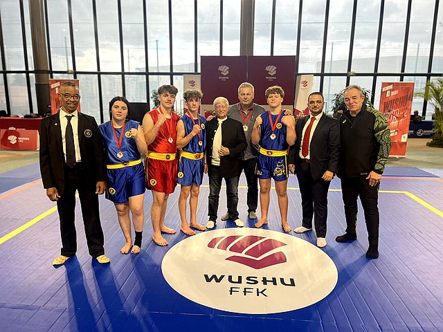 Open de France , Coupe de France, Championnat de France: Karaté Contact, Karaté Jutsu, Karaté Mix, Full-Contact, Sanda, Yoseikan Budo,Kick Boxing, Muay-Thaï, Shuai-Jiao Open de France de Sanda Light Contact 2025 avec les athlètes médaillés. |  | Open de France de Sanda Light Contact, le 25 octobre 2025 à Courbevoie. En présence de M. Mounir HARRATI, Président du Comité National Wushu à la FFK , de M. DAN Schwarz 9ème Duan, pionnier du Kung Fu en France et premier champion d'Europe aux Mondiaux de Taïwan en 1978, de M. Jules NAUD, Expert Fédéral, Membre du Comité Wushu (7ème Duan), et M. SERVI Emmanuel, venu encourager les sept athlètes laonnois. |