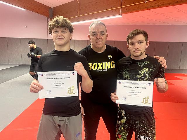 Open de France , Coupe de France, Championnat de France: Karaté Contact, Karaté Jutsu, Karaté Mix, Full-Contact, Sanda, Yoseikan Budo,Kick Boxing, Muay-Thaï, Shuai-Jiao Béchard Théo et Henneville Kenzo, détenteurs de leurs diplôme de ceinture noire obtenu le 7 décembre 2025. |  | | Obtention de la ceinture noire 1er Dan par Béchard Théo et Henneville Kenzo, le 7 décembre 2025 à Gauchy (02430). |