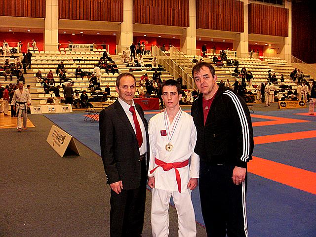 Open de France , Coupe de France, Championnat de France: Karaté Contact, Karaté Jutsu, Karaté Mix, Full-Contact, Sanda, Yoseikan Budo,Kick Boxing, Muay-Thaï, Shuai-Jiao Steven Quaneaux Champion de France 2011 de Karaté Jutsu en compagnie de son Professeur Demerin David et Monsieur Bilicki 9 dan responsable du Karaté Jutsu |  |