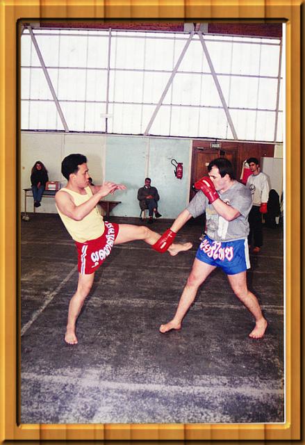 Stage avec les pionniers du Muay Thaï en France. Et de véritable champion et légende de la Boxe Thaïlandaise et du Kick Boxing dans l'exagone Blocage bas sur un front kick jambe avant avec un contre du direct bras arrière avec le légendaire Pud Pat Noy Worawoot |  |