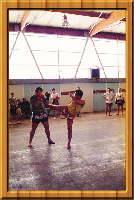 Stage avec les pionniers du Muay Thaï en France. Et de véritable champion et légende de la Boxe Thaïlandaise et du Kick Boxing dans l'exagone Blocage avec l'avant bras d'un middle Kick effectué avec une protection du visage par le légendaire Pud Pad Noy du pur Muay Thaî authentique |  |