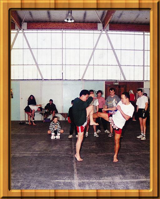 Stage avec les pionniers du Muay Thaï en France. Et de véritable champion et légende de la Boxe Thaïlandaise et du Kick Boxing dans l'exagone Travail typique de muay thaï bloquage de Pud Pad Noy Worawoot d'un middle Kick de Kitty Phongdunbum |  |