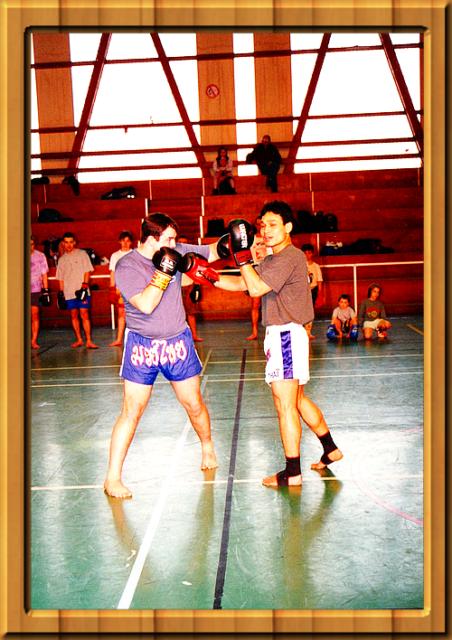 Stage avec les pionniers du Muay Thaï en France. Et de véritable champion et légende de la Boxe Thaïlandaise et du Kick Boxing dans l'exagone Travail du crochet gauche en protection avec le bras arrière au menton avec le légendaire Krongsak |  | | Travail du crochet gauche avec protection du bras arrière au menton avec le légendaire Krongsak. |