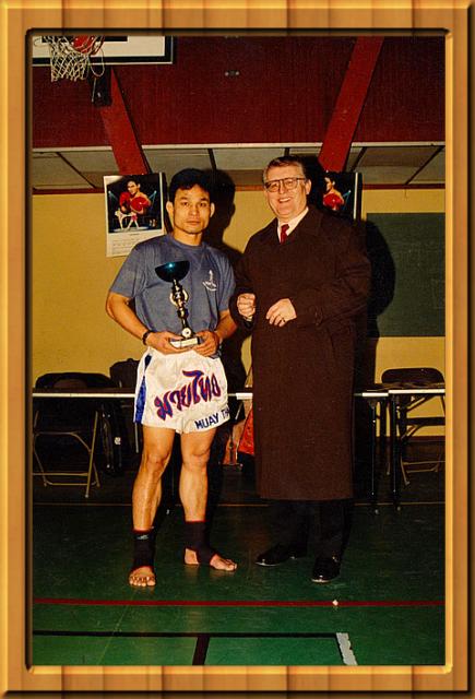 Stage avec les pionniers du Muay Thaï en France. Et de véritable champion et légende de la Boxe Thaïlandaise et du Kick Boxing dans l'exagone Monsieur Jean Claude Lamant Député Maire de la Ville de Laon en 1996 en compagnie du Légendaire Champion du Monde de Muay Thaï Krongsak |  |